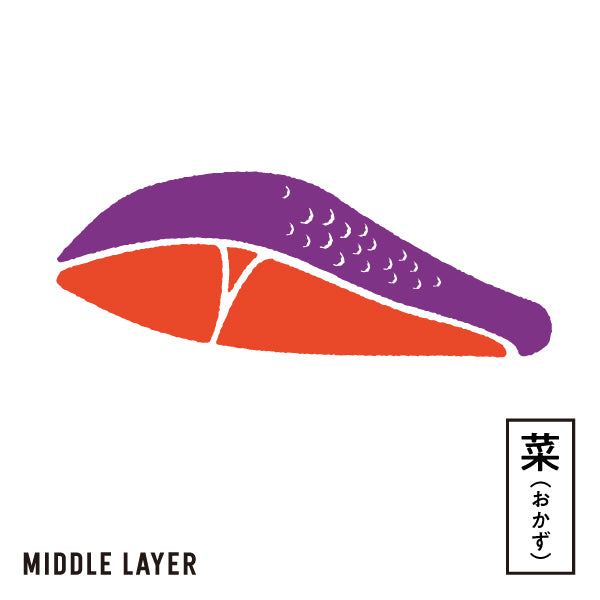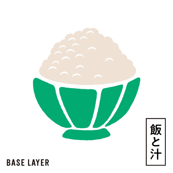 和食の特徴のひとつである「一汁三菜」をレイヤリングシステムとして解釈しました。「一汁三菜」とは「飯と汁」を軸に、いくつかの「菜(おかず)」で栄養バランスをとり、香りや食感を「香の物」で補うという考え方のことですが、この献立の構造を踏まえると、食もまた道具であるということが理解しやすくなります。YAMABUSHI TRAIL FOODSは、一食の献立をレイヤリングとして捉えることで、行程中の食事の構成を“編集”する知恵を身につけたいと願っています。