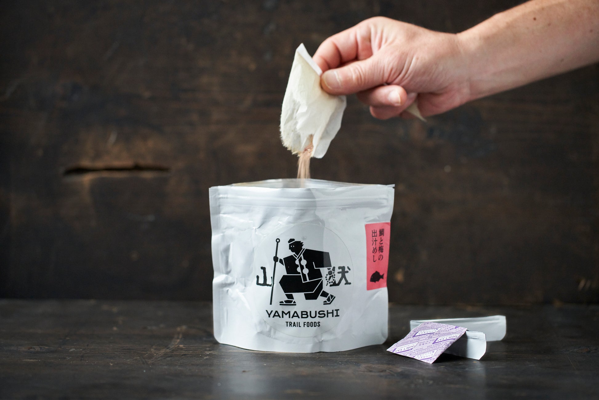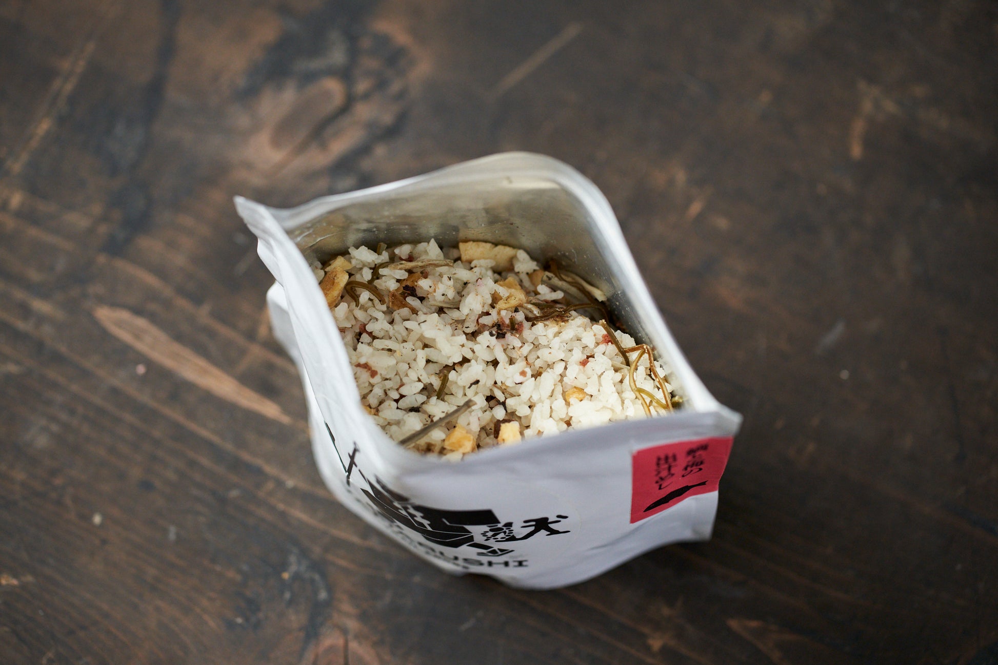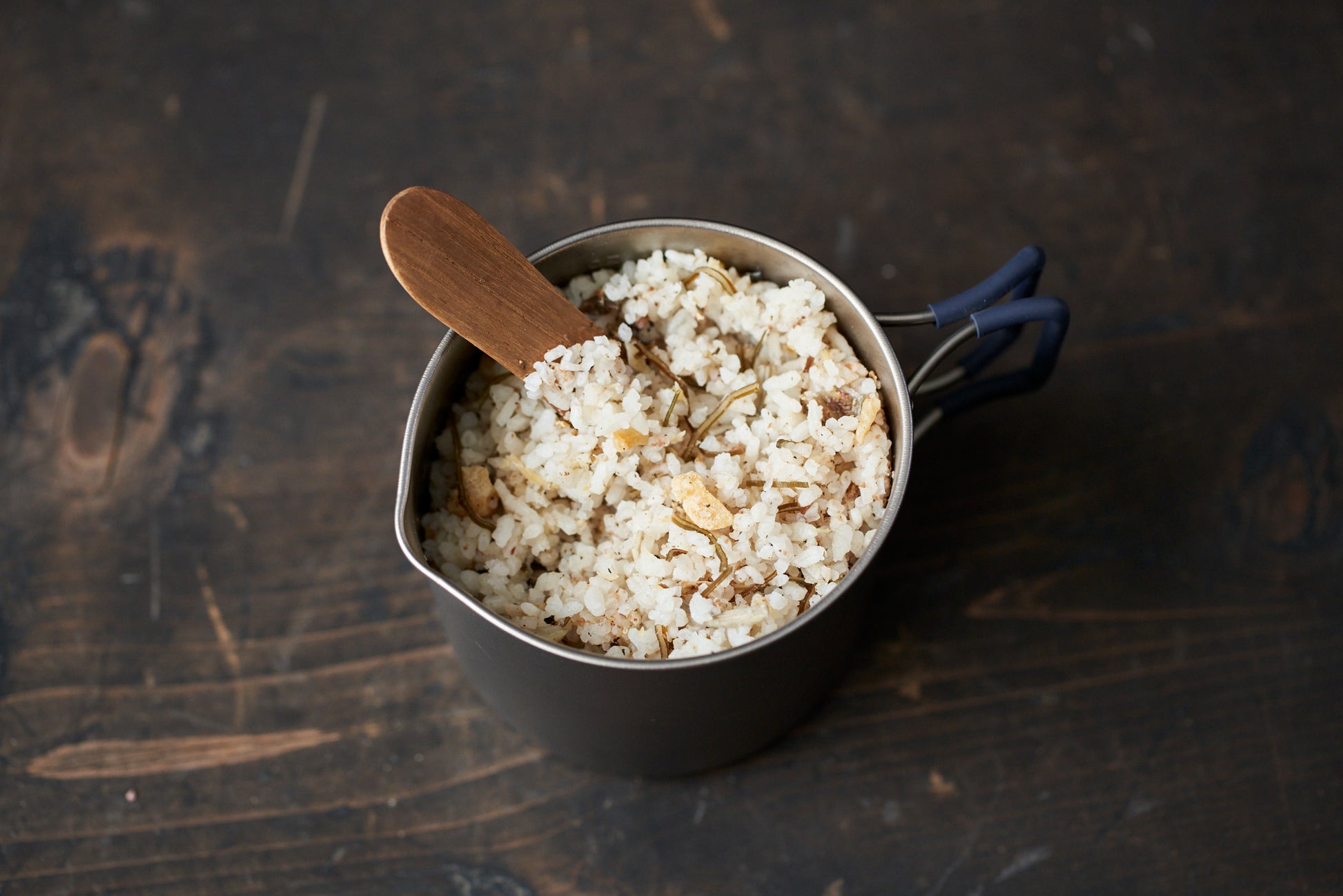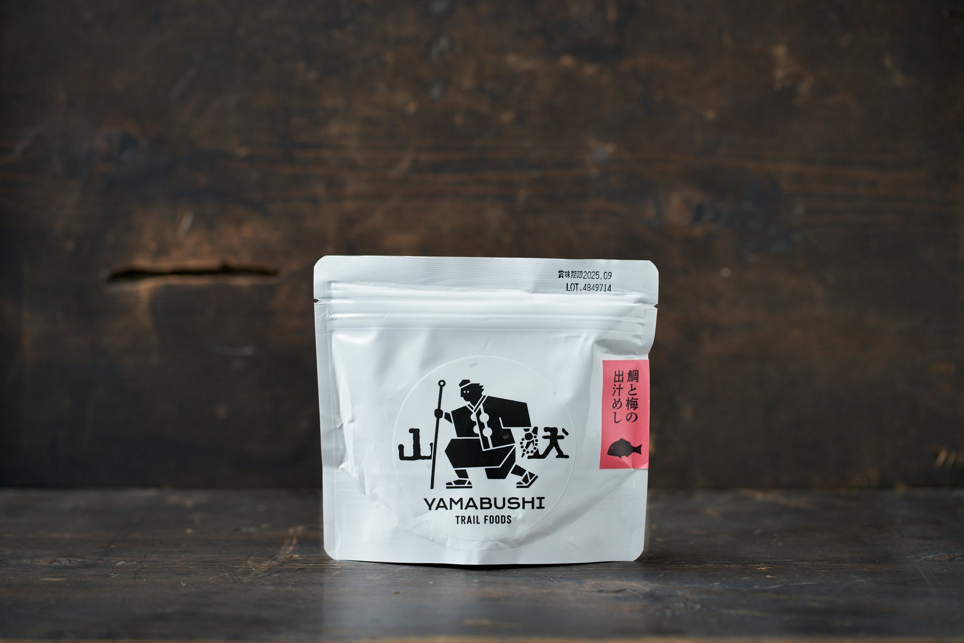 梅としそが香る鯛めしです。鯛、ごぼう、しょうがを炊き合わせた後に乾燥させ、アルファ化米と合わせました。同梱の粉末調味料は、利尻昆布とかつおぶしをふんだんに使用した天然素材のだしの素。京都「おだしのうね乃」さんと共同開発しました。うま味調味料は使っていません。